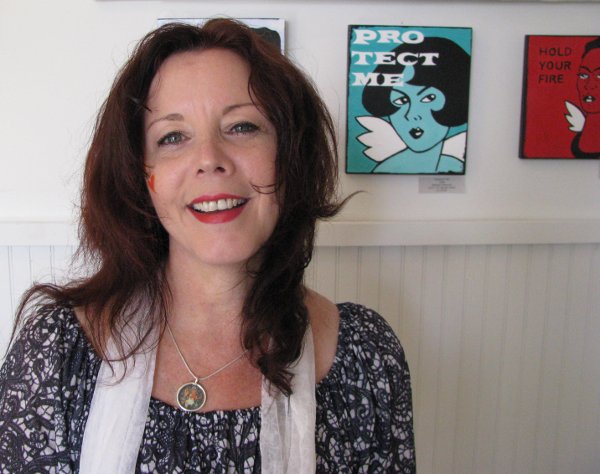 Artist Bethann Shannon stands next to her Angel Paintings at Berkshire Artists Colony Gallery in North Adams, Ma at The “DOWN STREET ART” event.